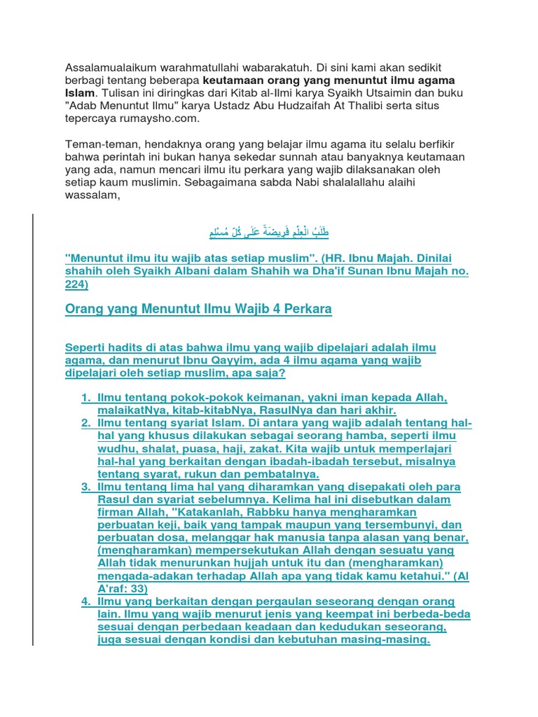 Menuntut ilmu merupakan hal yang wajib dilakukan oleh kita sebagai umat manusia. Hadits yang mulia ini menunjukkan agungnya kedudukan ilmu agama dan keutamaan yang besar bagi orang yang mempelajarinya sehingga imam an nawawi dalam kitabnya riyadhush shalihin pada pembahasan keutamaan ilmu mencantumkan hadits ini sebagai hadits yang pertama. Keutamaan keutamaan ilmu dan pemilik ilmu hal yang disayangkan ternyata beberapa majelis ilmu sudah tidak memiliki daya magnet yang bisa memikat umat islam untuk duduk di sana bersimpuh di hadapan allah untuk meluangkan waktu mengkaji firman firman allah azza wa jalla dan hadist nabi shallallahu alaihi wa sallam.